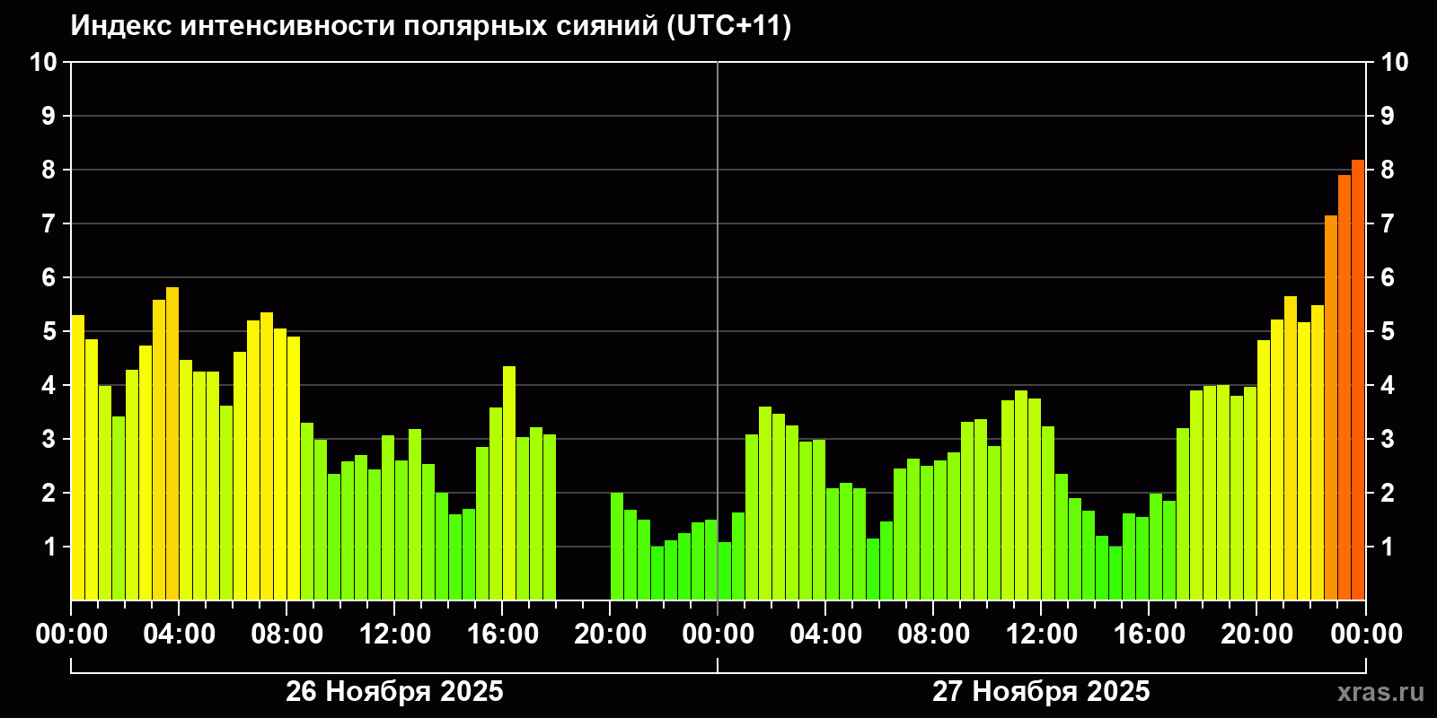 Изменения индекса интенсивности полярных сияний с 2025-11-26 по 2025-11-27 по местному времени