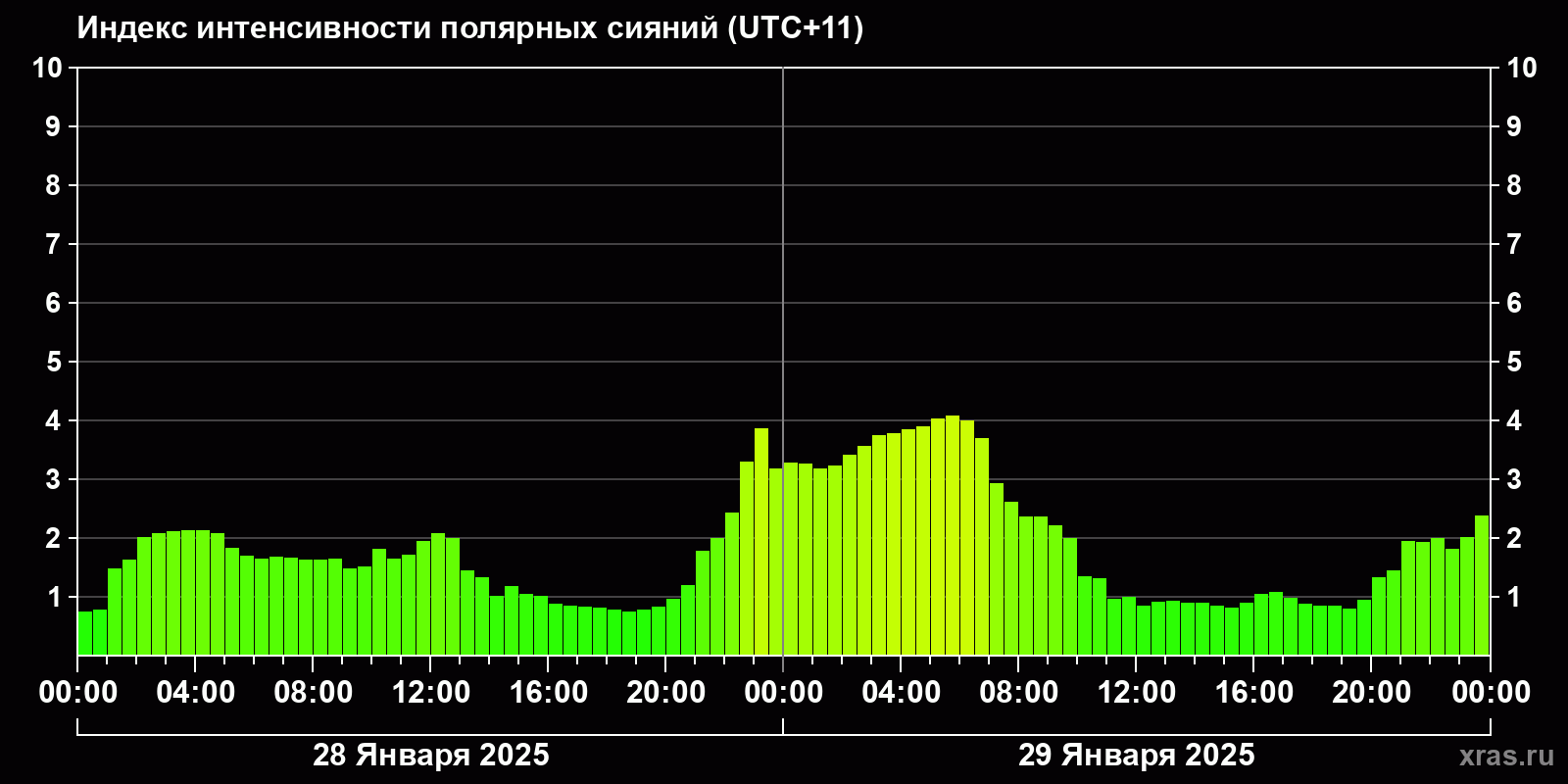 Изменения индекса интенсивности полярных сияний с 2025-01-28 по 2025-01-29 по местному времени
