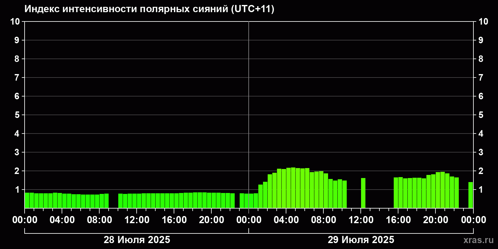 Изменения индекса интенсивности полярных сияний с 2025-07-28 по 2025-07-29 по местному времени