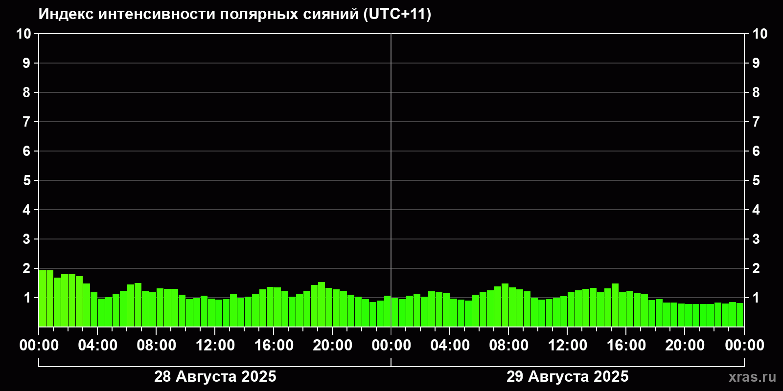 Изменения индекса интенсивности полярных сияний с 2025-08-28 по 2025-08-29 по местному времени
