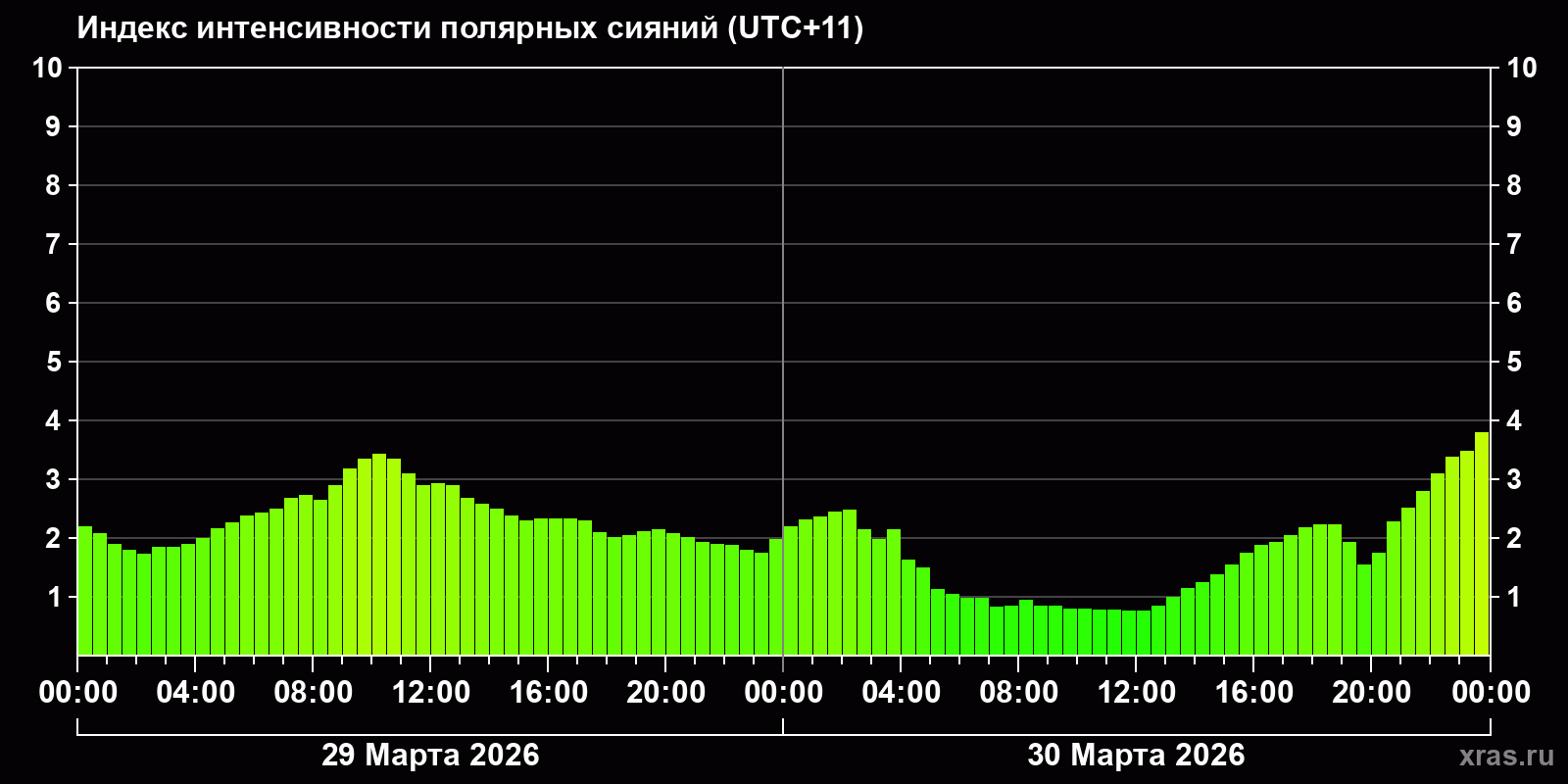 Изменения индекса интенсивности полярных сияний с 2026-03-29 по 2026-03-30 по местному времени