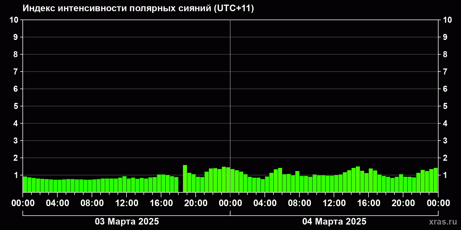 Изменения индекса интенсивности полярных сияний с 2025-03-03 по 2025-03-04 по местному времени