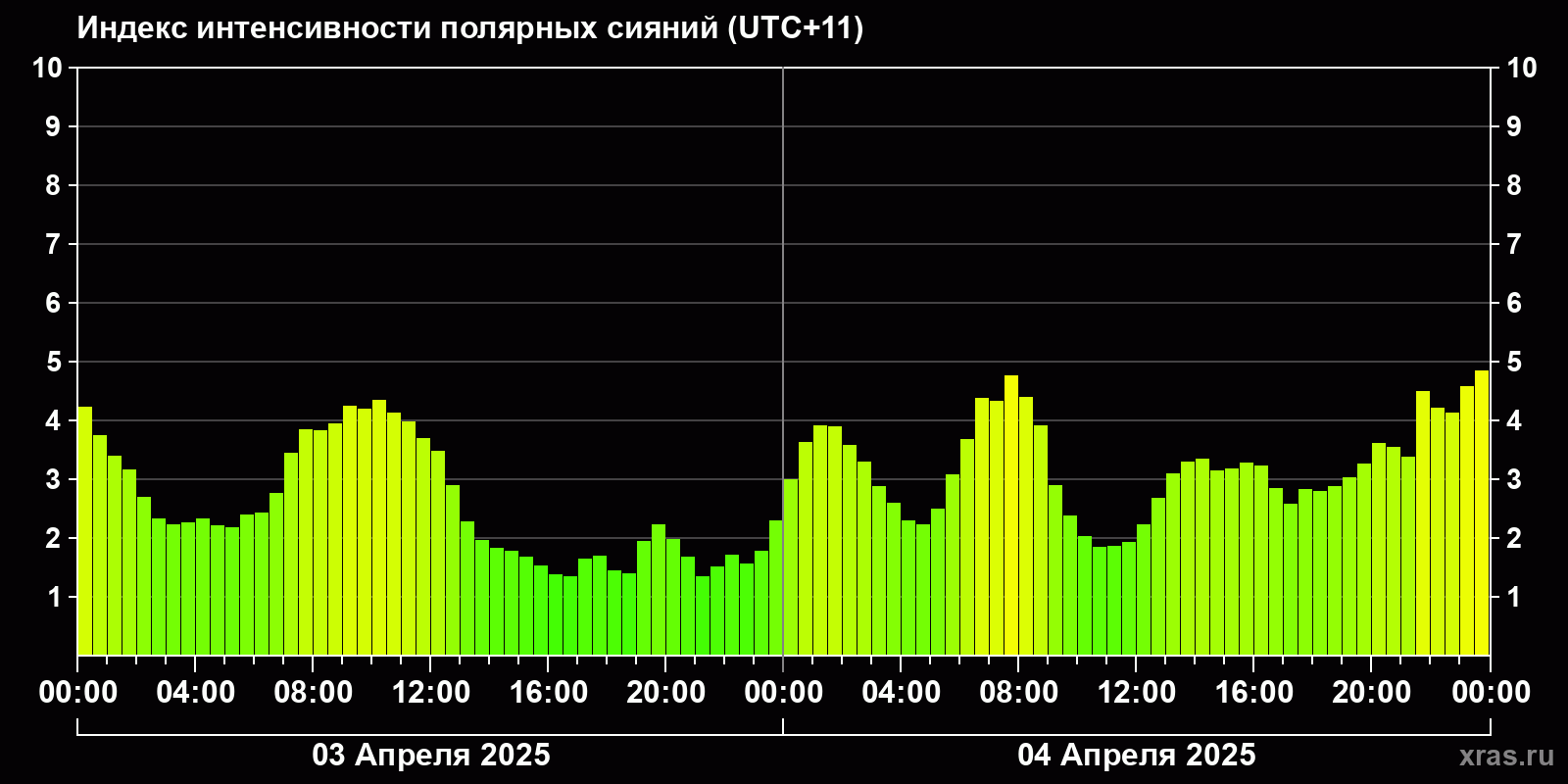 Изменения индекса интенсивности полярных сияний с 2025-04-03 по 2025-04-04 по местному времени