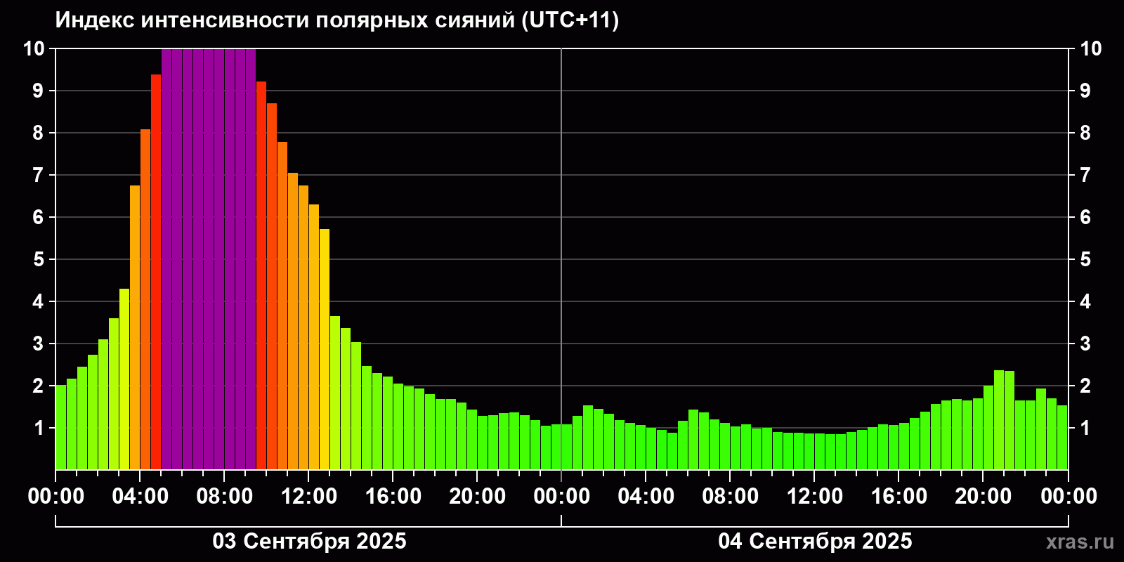 Изменения индекса интенсивности полярных сияний с 2025-09-03 по 2025-09-04 по местному времени