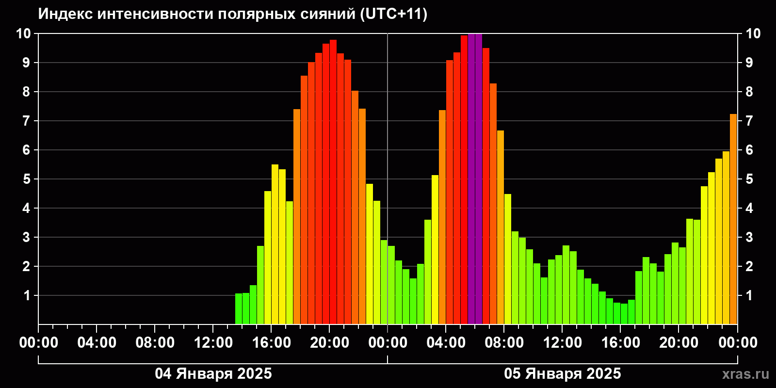 Изменения индекса интенсивности полярных сияний с 2025-01-04 по 2025-01-05 по местному времени