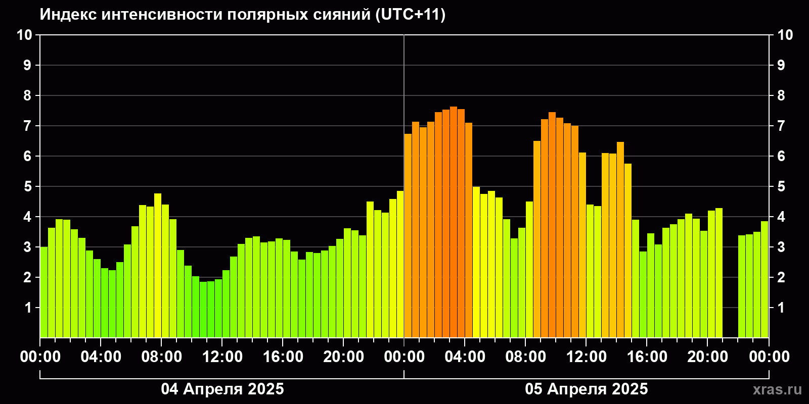 Изменения индекса интенсивности полярных сияний с 2025-04-04 по 2025-04-05 по местному времени