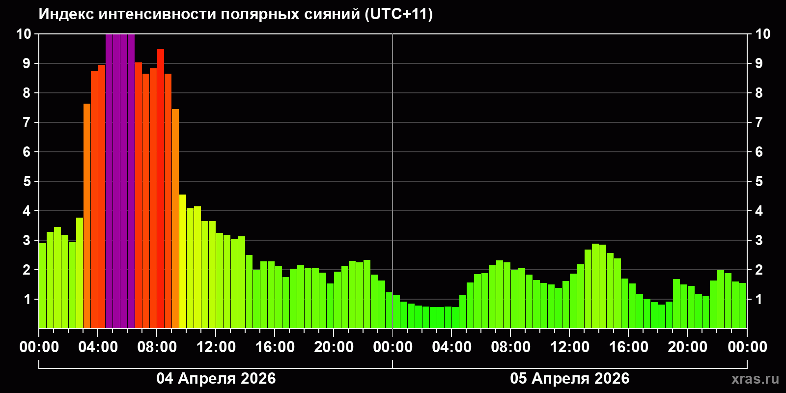 Изменения индекса интенсивности полярных сияний с 2026-04-04 по 2026-04-05 по местному времени