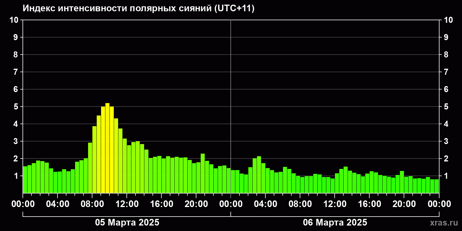 Изменения индекса интенсивности полярных сияний с 2025-03-05 по 2025-03-06 по местному времени