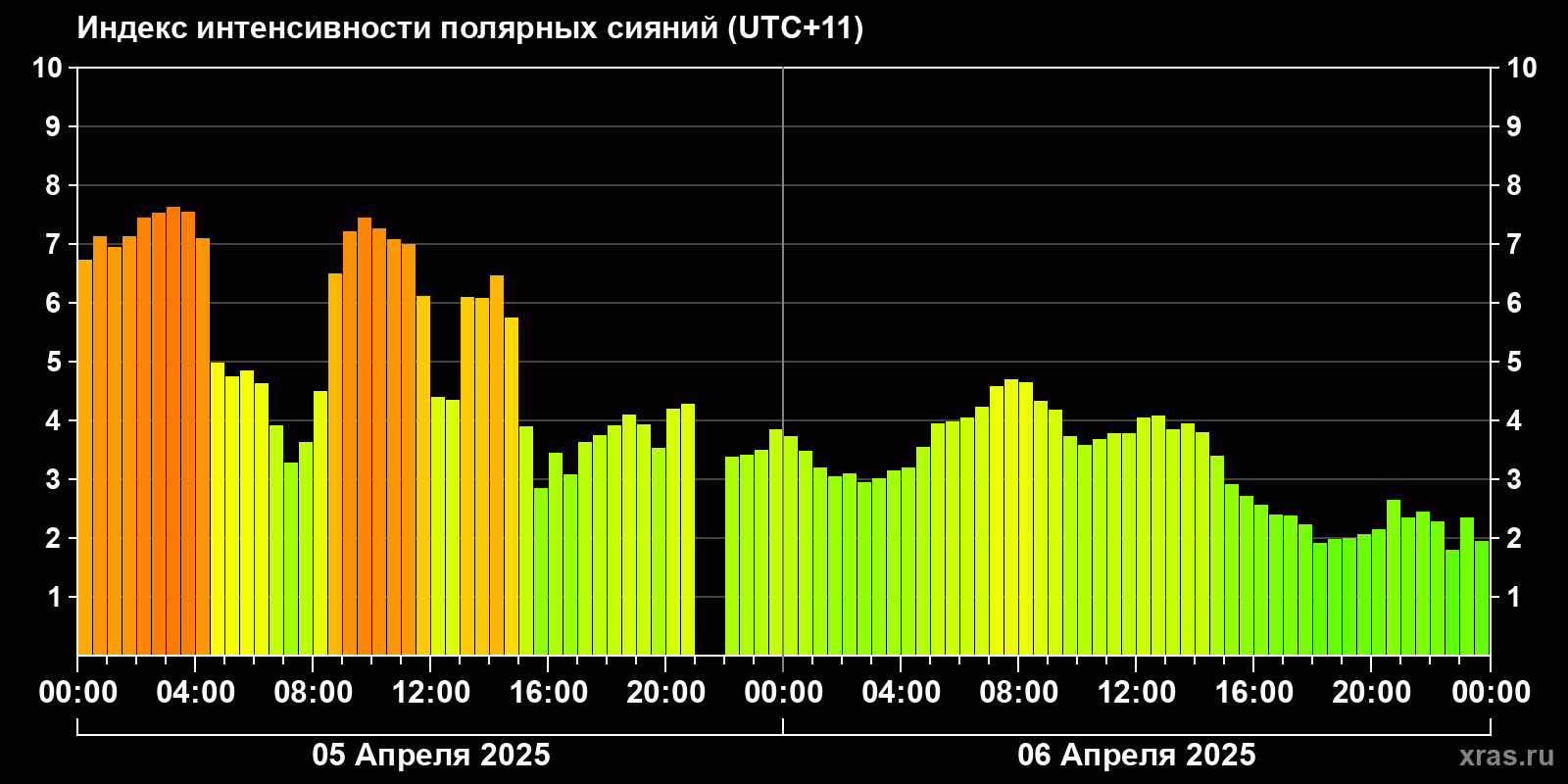 Изменения индекса интенсивности полярных сияний с 2025-04-05 по 2025-04-06 по местному времени