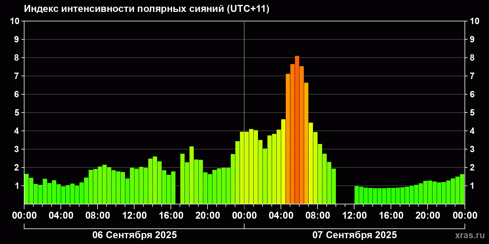 Изменения индекса интенсивности полярных сияний с 2025-09-06 по 2025-09-07 по местному времени