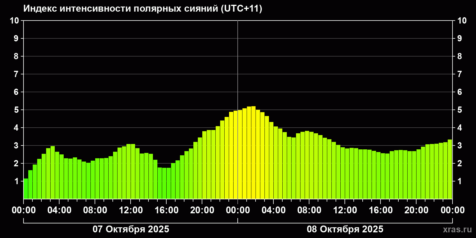 Изменения индекса интенсивности полярных сияний с 2025-10-07 по 2025-10-08 по местному времени