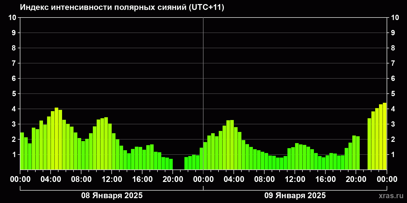 Изменения индекса интенсивности полярных сияний с 2025-01-08 по 2025-01-09 по местному времени