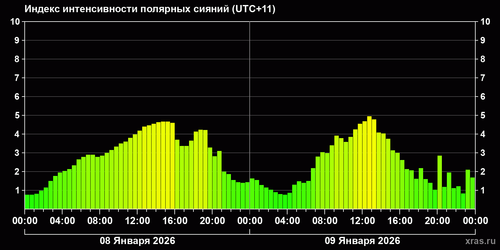 Изменения индекса интенсивности полярных сияний с 2026-01-08 по 2026-01-09 по местному времени