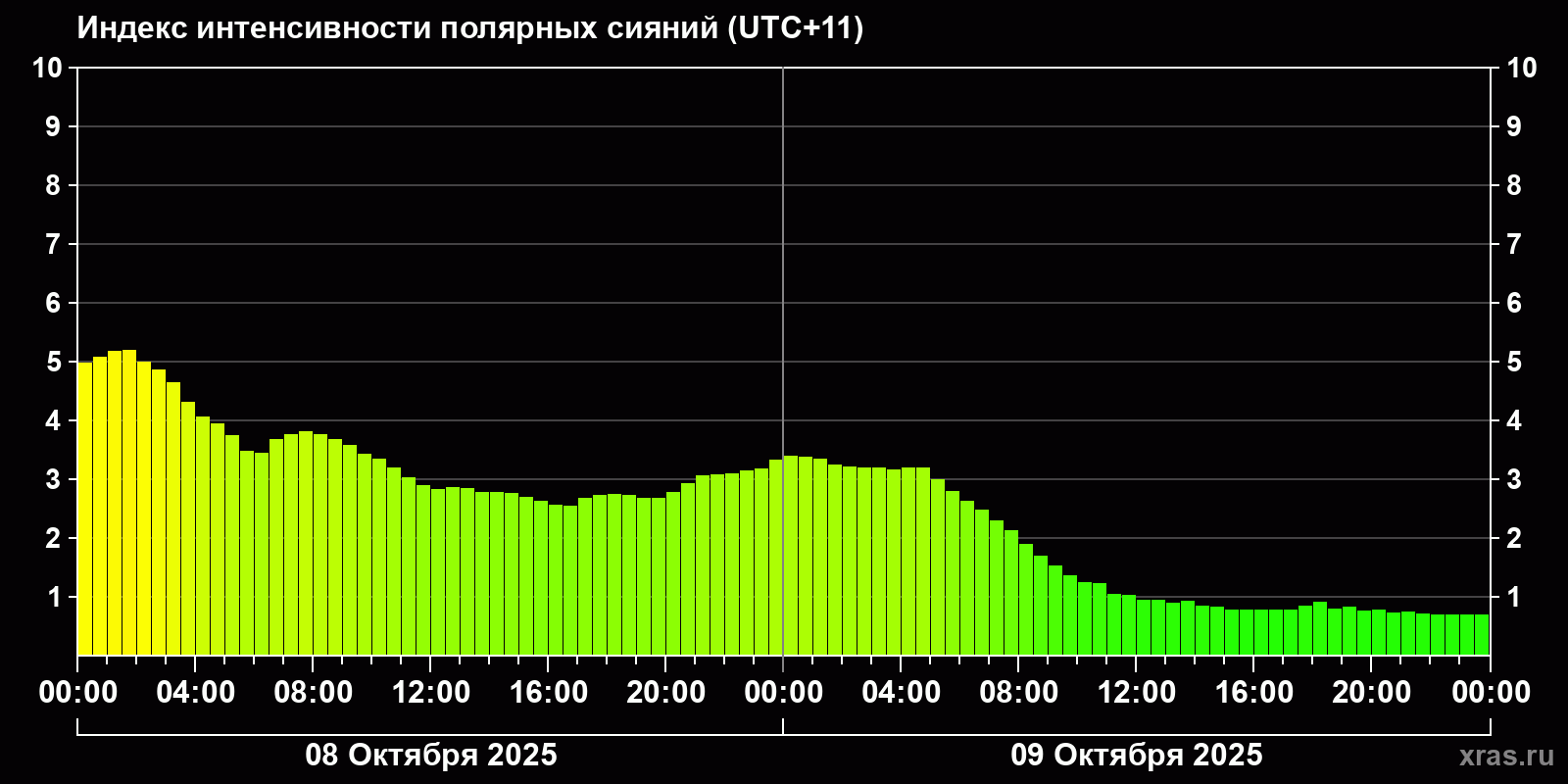 Изменения индекса интенсивности полярных сияний с 2025-10-08 по 2025-10-09 по местному времени