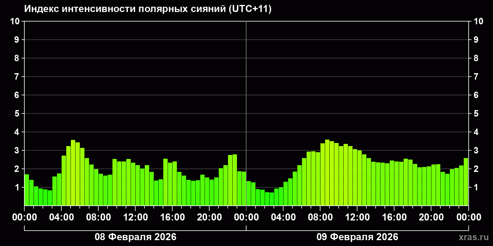 Изменения индекса интенсивности полярных сияний с 2026-02-08 по 2026-02-09 по местному времени