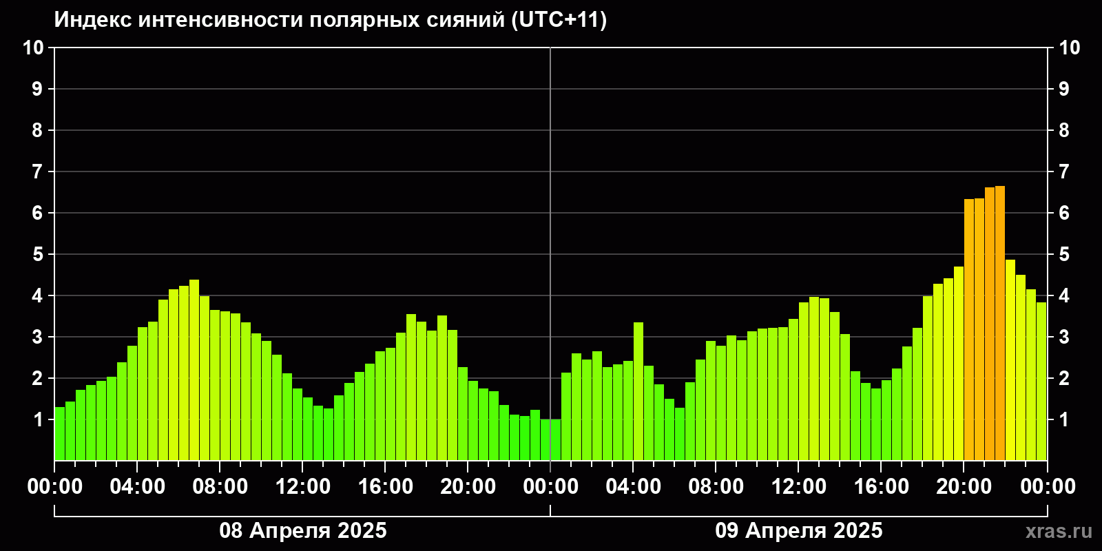 Изменения индекса интенсивности полярных сияний с 2025-04-08 по 2025-04-09 по местному времени