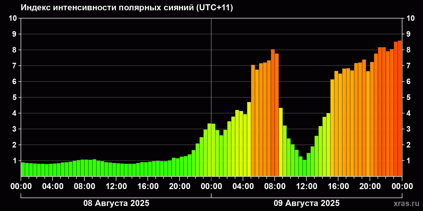 Изменения индекса интенсивности полярных сияний с 2025-08-08 по 2025-08-09 по местному времени