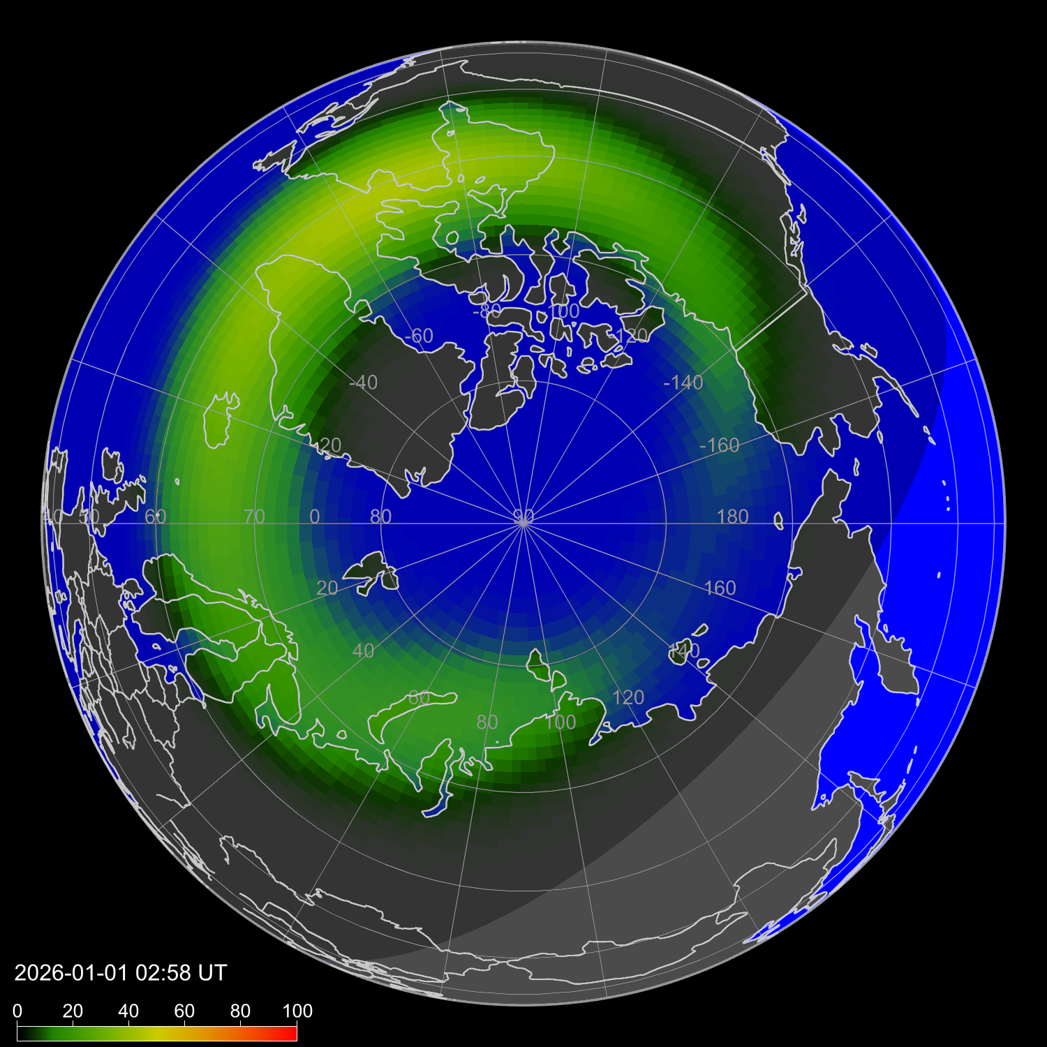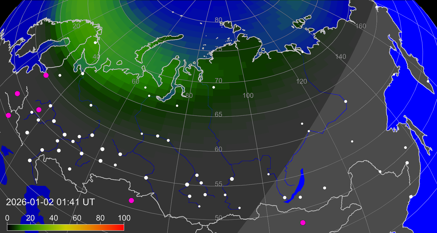 Изменения и часовой прогноз индекса интенсивности полярных сияний с 2026-01-01 по 2026-01-02