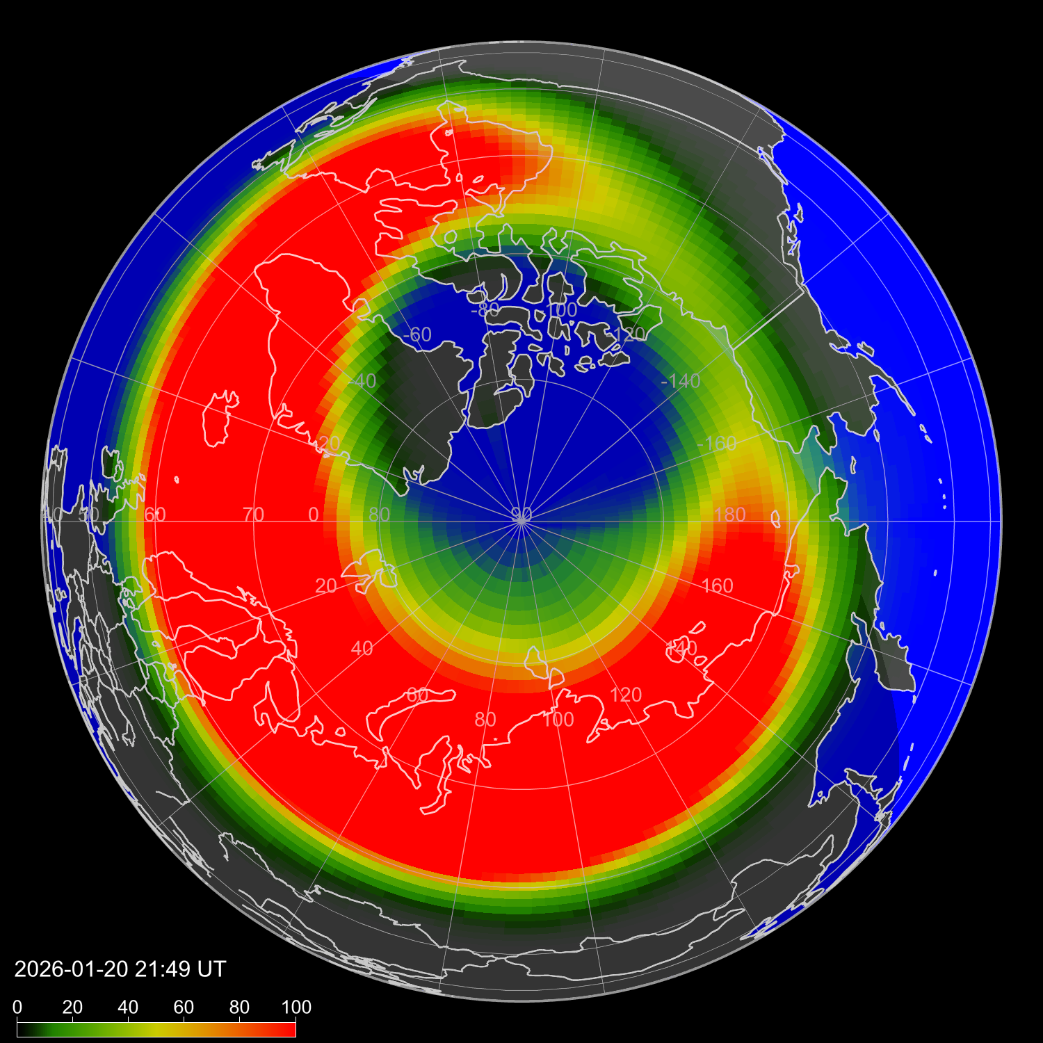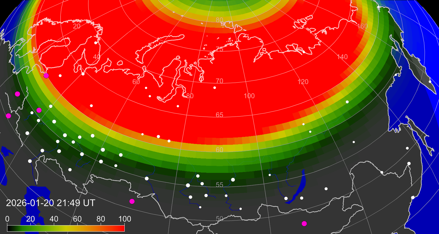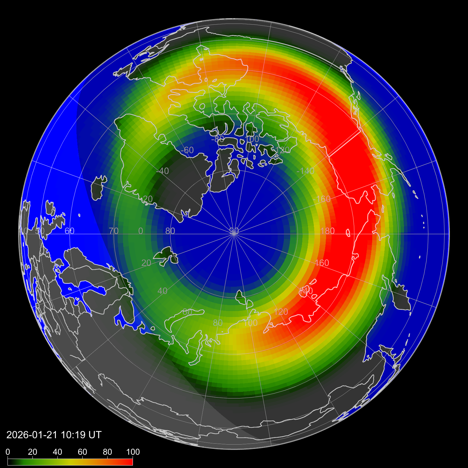 Изменения и часовой прогноз индекса интенсивности полярных сияний с 2026-01-21 по 2026-01-22