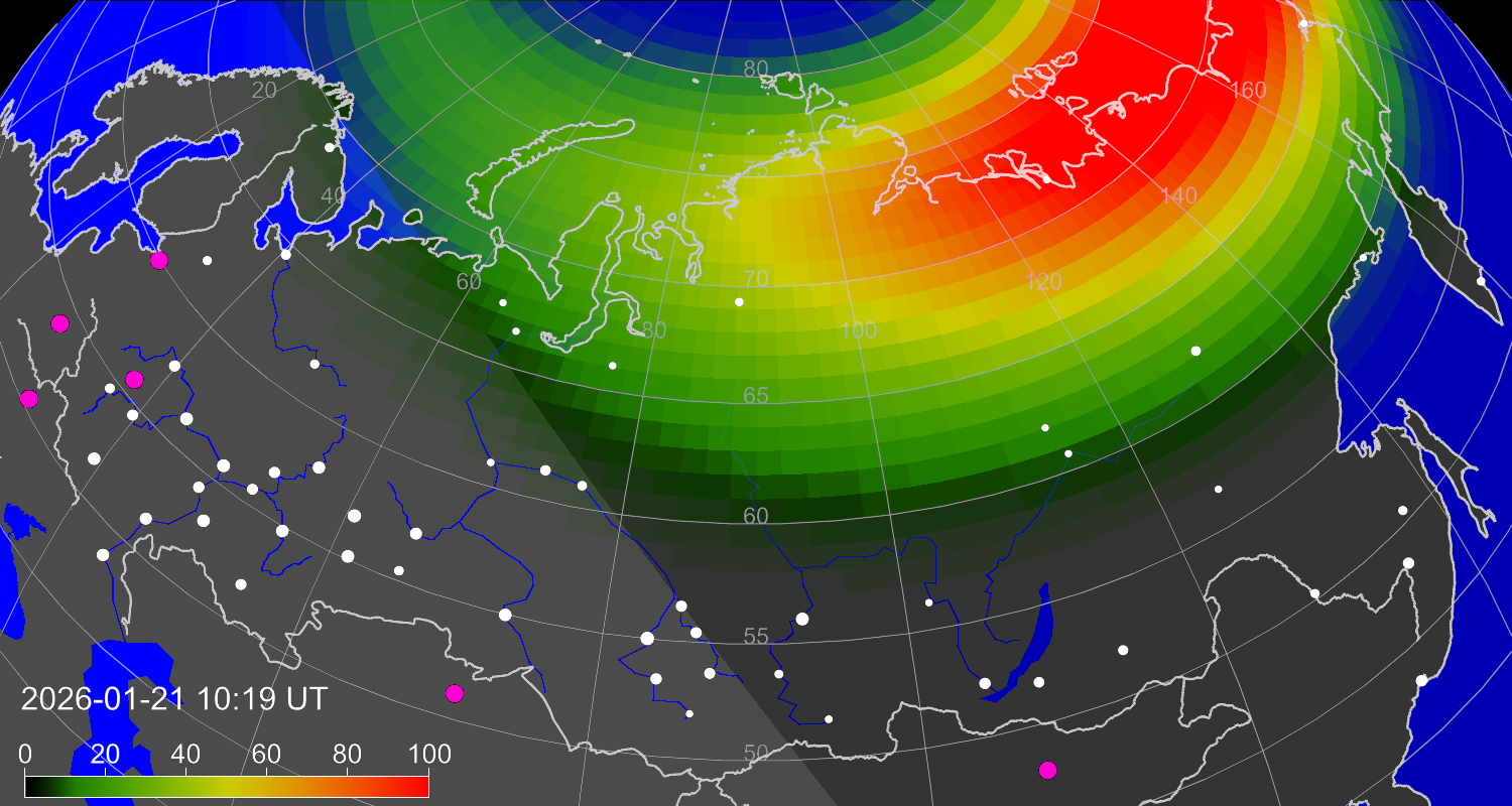 Индекс интенсивности полярных сияний и теоретически возможная широта наблюдений для ночного времени в восточном полушарии