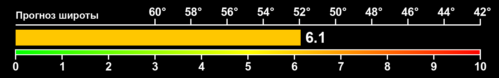 Индекс интенсивности полярных сияний и теоретически возможная широта наблюдений для ночного времени в западном полушарии по состоянию на 2026-02-15 23:50 (конец дня) по местному времени