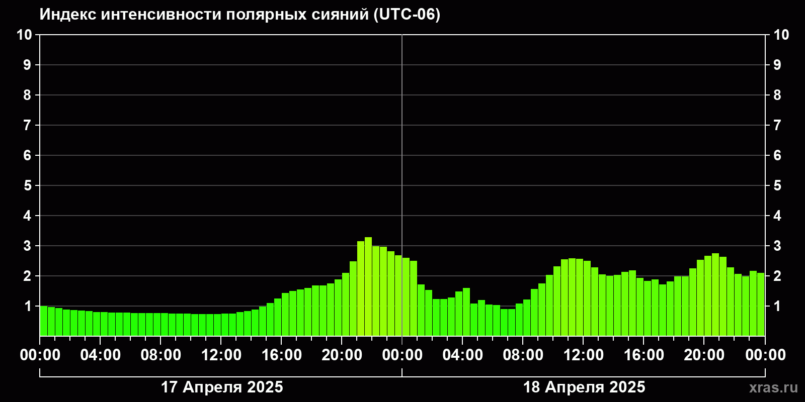 Изменения индекса интенсивности полярных сияний с 2025-04-17 по 2025-04-18 по местному времени