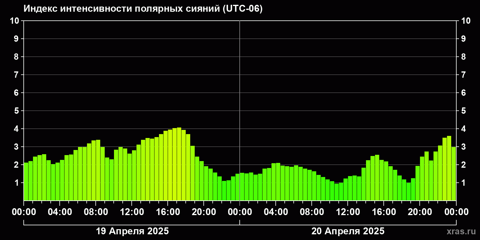 Изменения индекса интенсивности полярных сияний с 2025-04-19 по 2025-04-20 по местному времени