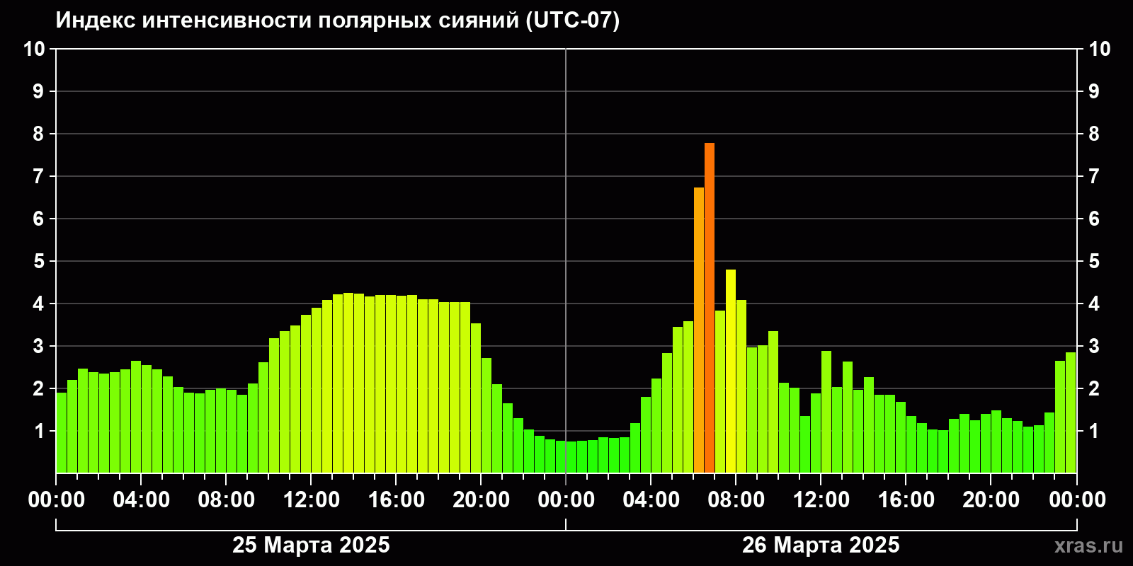 Изменения индекса интенсивности полярных сияний с 2025-03-25 по 2025-03-26 по местному времени