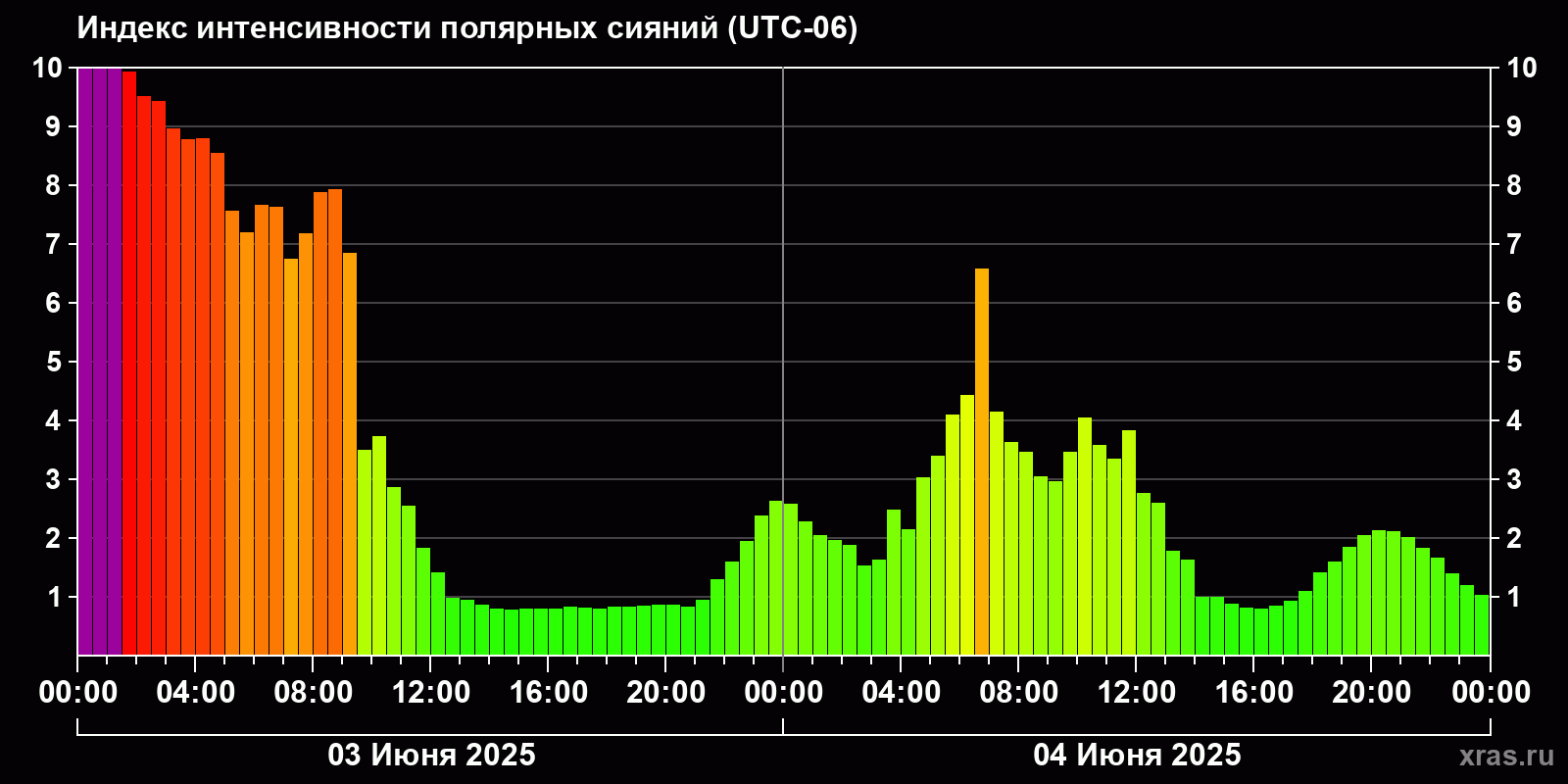 Изменения индекса интенсивности полярных сияний с 2025-06-03 по 2025-06-04 по местному времени