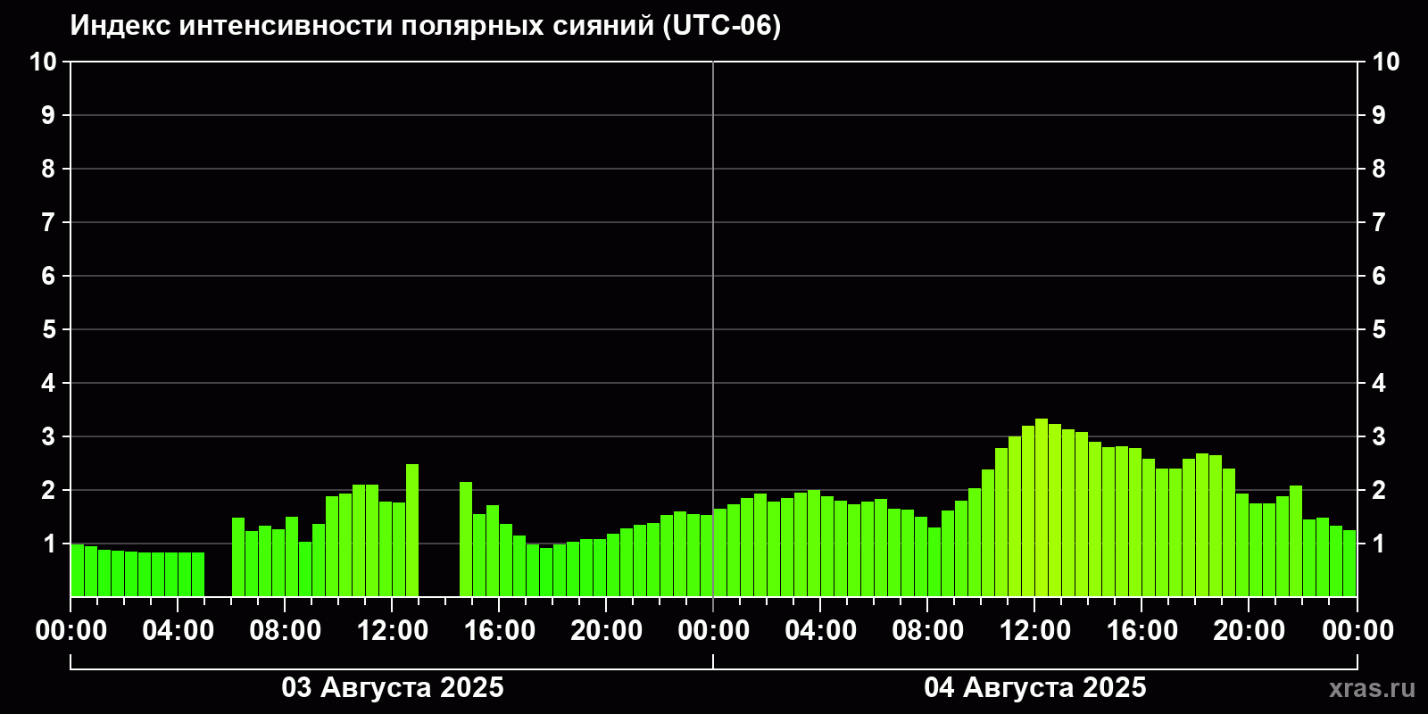 Изменения индекса интенсивности полярных сияний с 2025-08-03 по 2025-08-04 по местному времени