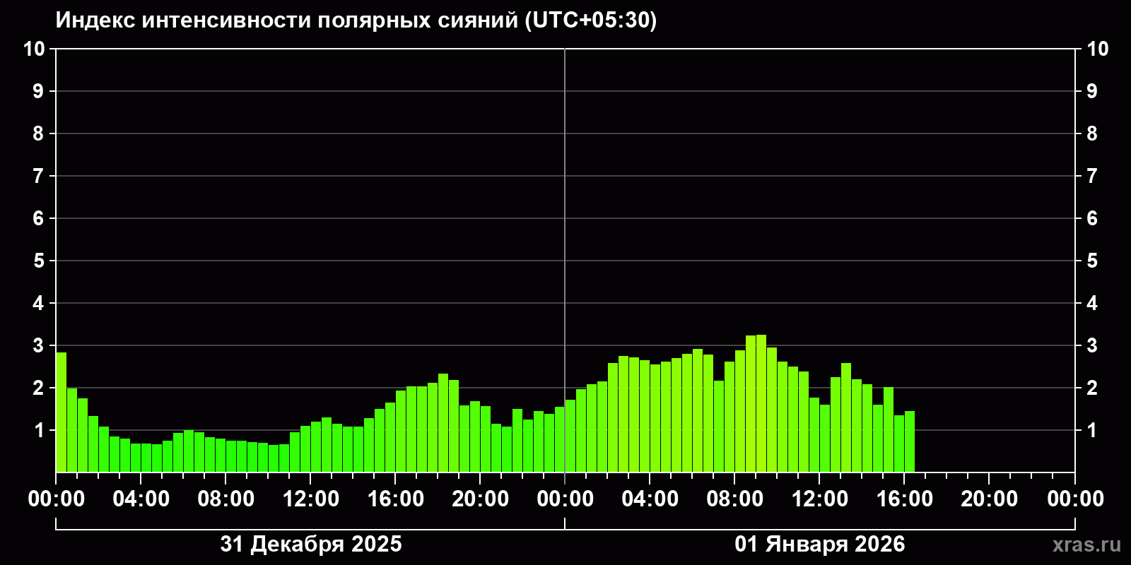 Изменения индекса интенсивности полярных сияний с 2025-12-31 по 2026-01-01 по местному времени