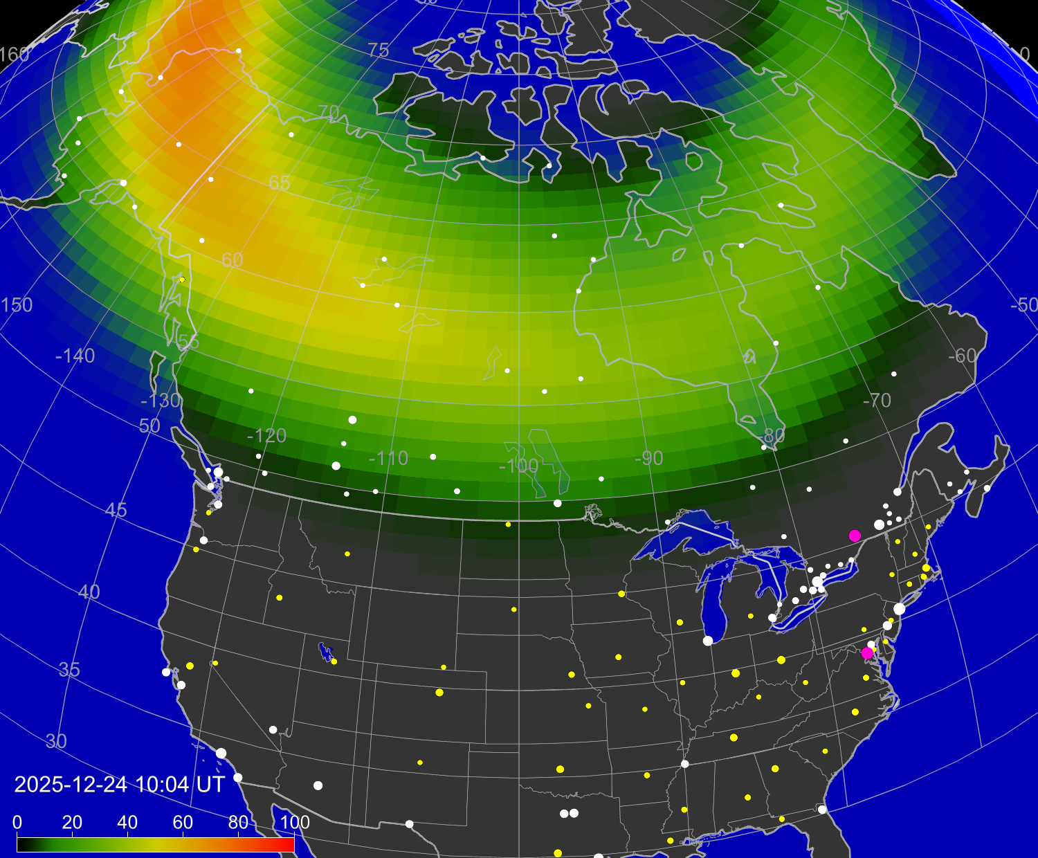 Изменения и часовой прогноз индекса интенсивности полярных сияний с 2025-12-23 по 2025-12-24