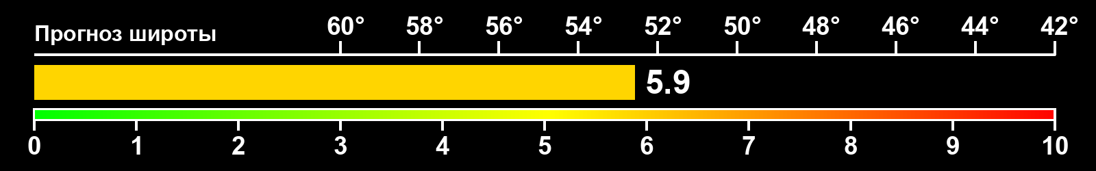Индекс интенсивности полярных сияний и теоретически возможная широта наблюдений для ночного времени в западном полушарии по состоянию на 2025-11-27 23:46 (конец дня) по местному времени