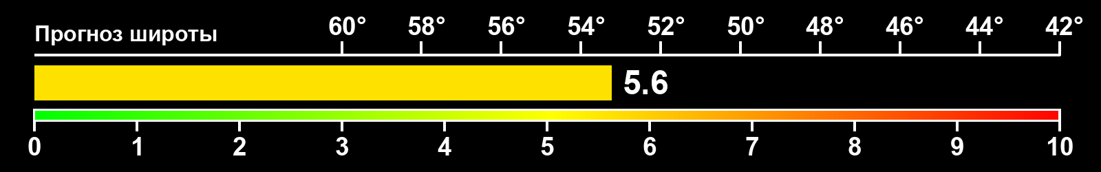 Индекс интенсивности полярных сияний и теоретически возможная широта наблюдений для ночного времени в западном полушарии по состоянию на 2025-12-03 23:57 (конец дня) по местному времени