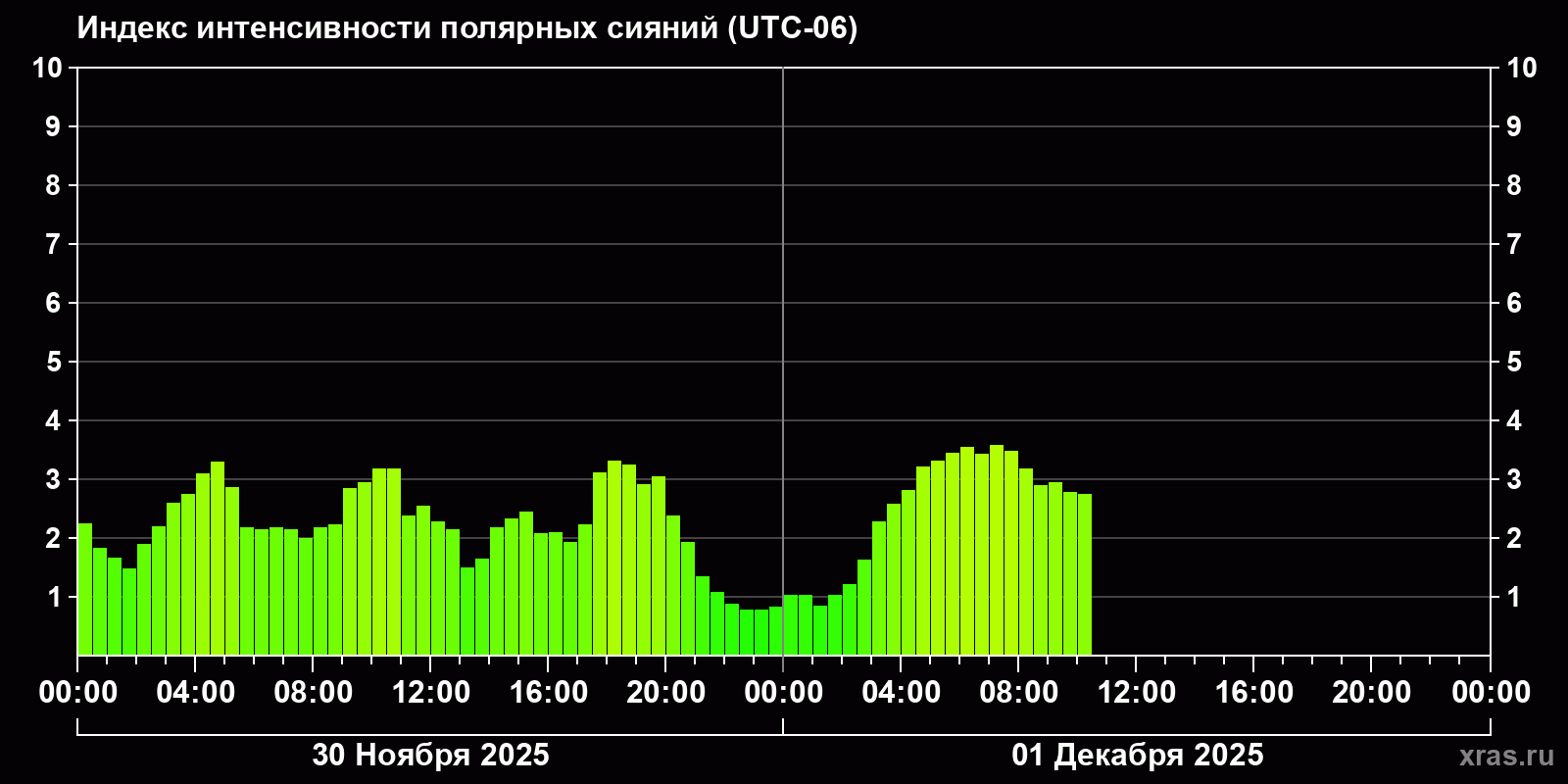 Изменения индекса интенсивности полярных сияний с 2025-11-30 по 2025-12-01 по местному времени