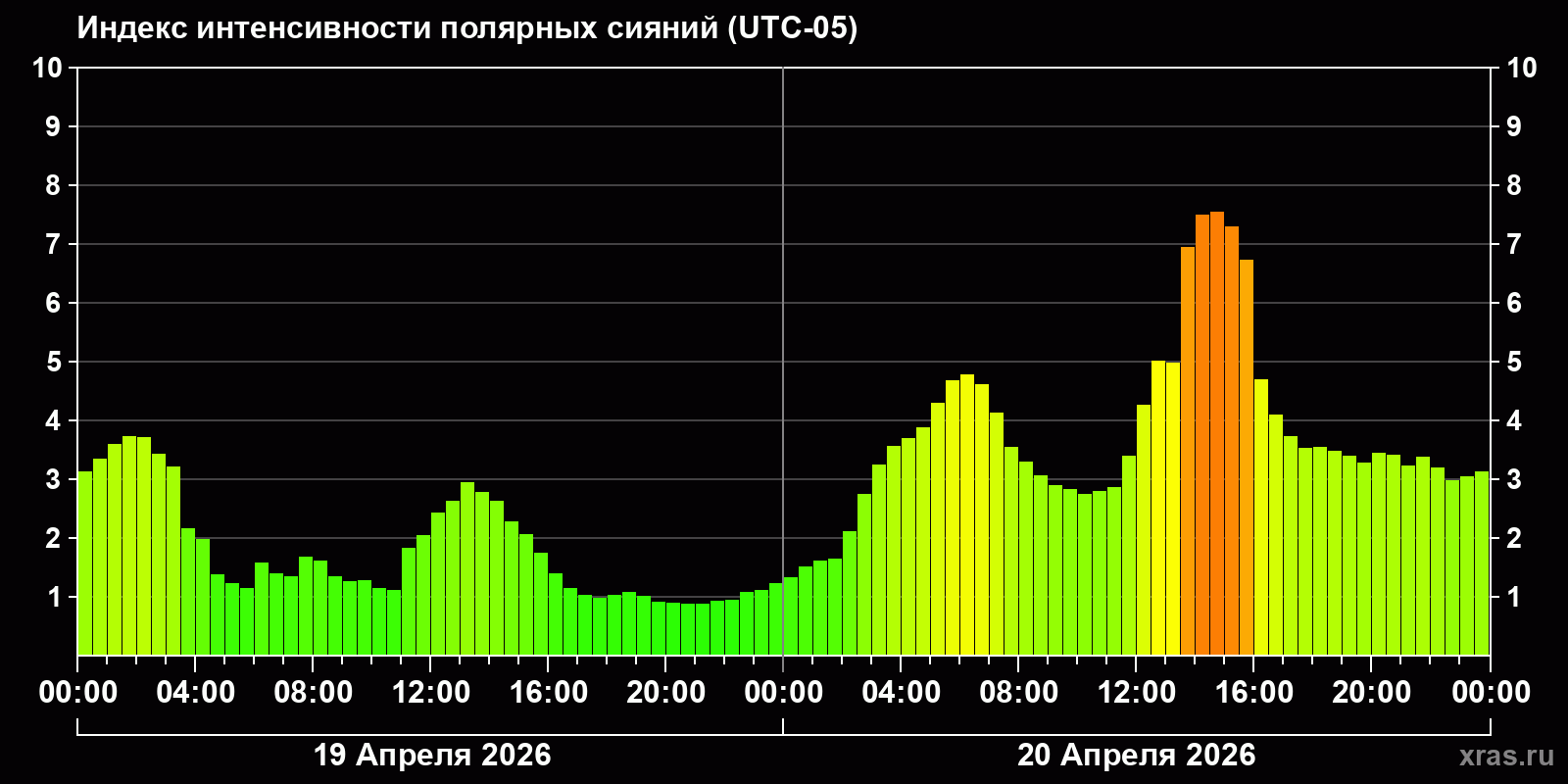Изменения индекса интенсивности полярных сияний с 2026-04-19 по 2026-04-20 по местному времени
