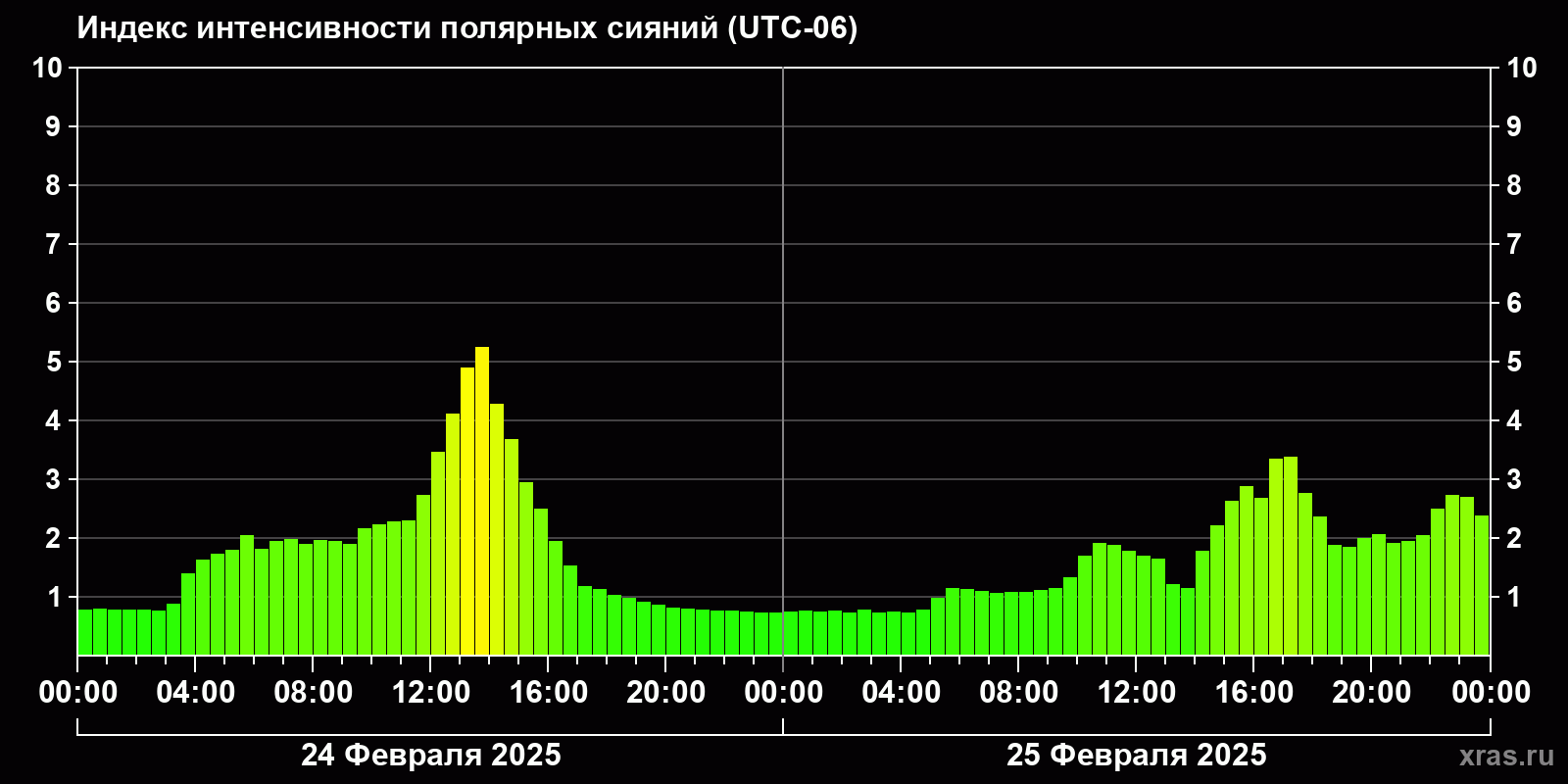 Изменения индекса интенсивности полярных сияний с 2025-02-24 по 2025-02-25 по местному времени