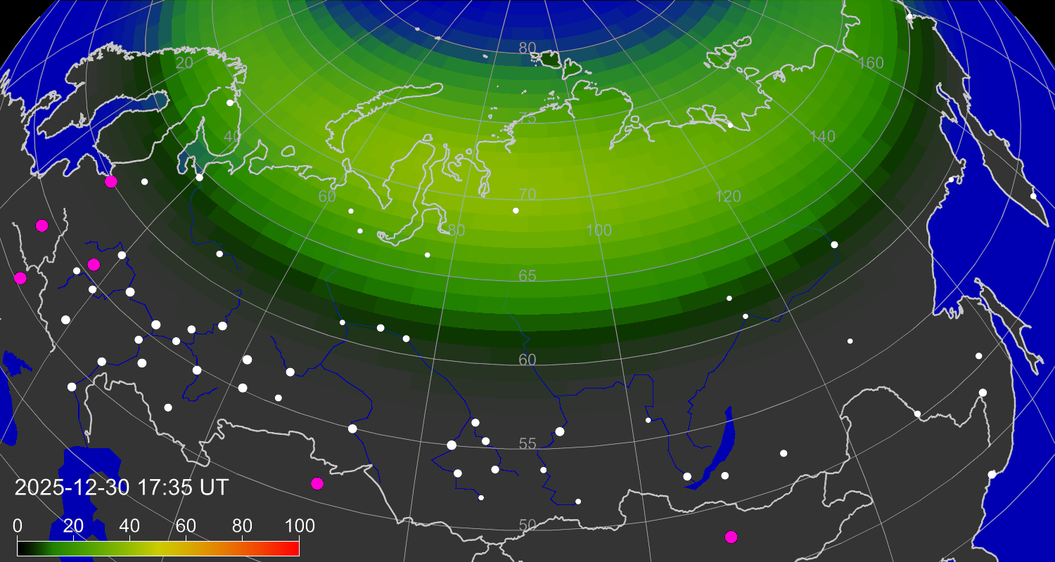 Индекс интенсивности полярных сияний и теоретически возможная широта наблюдений для ночного времени в восточном полушарии