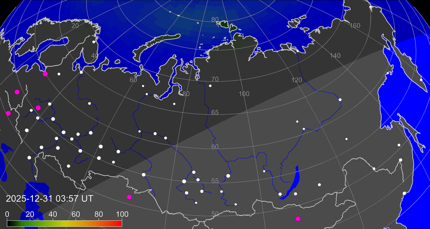 Изменения и часовой прогноз индекса интенсивности полярных сияний с 2025-12-31 по 2026-01-01