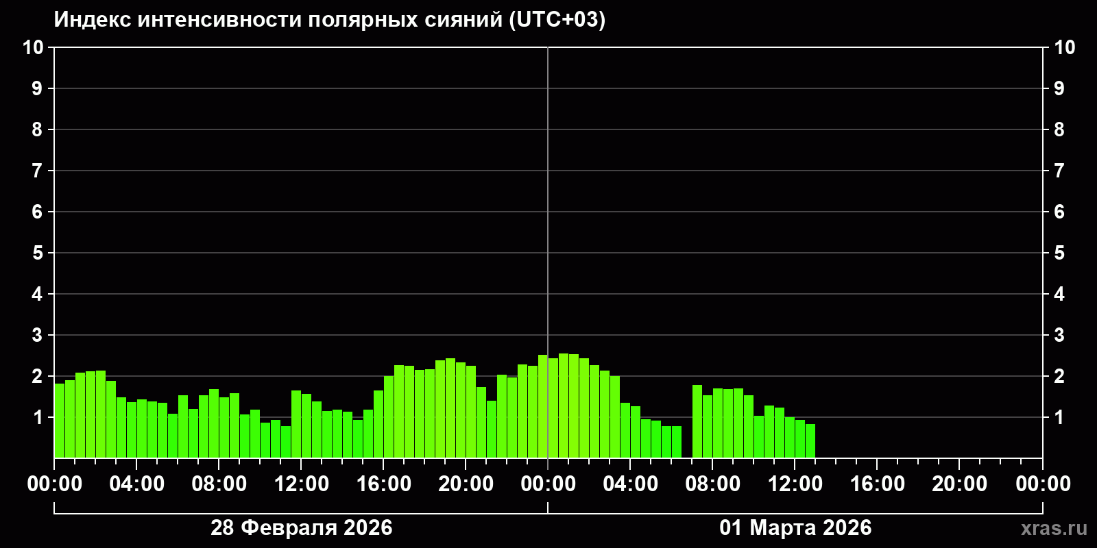 Изменения индекса интенсивности полярных сияний с 2026-02-28 по 2026-03-01 по местному времени