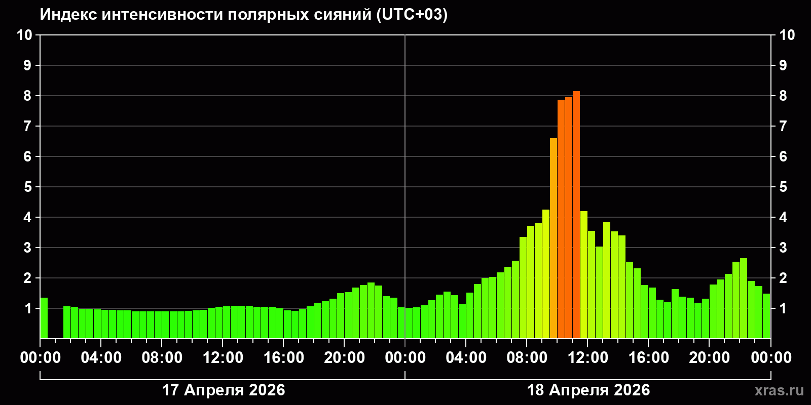 Изменения индекса интенсивности полярных сияний с 2026-04-17 по 2026-04-18 по местному времени