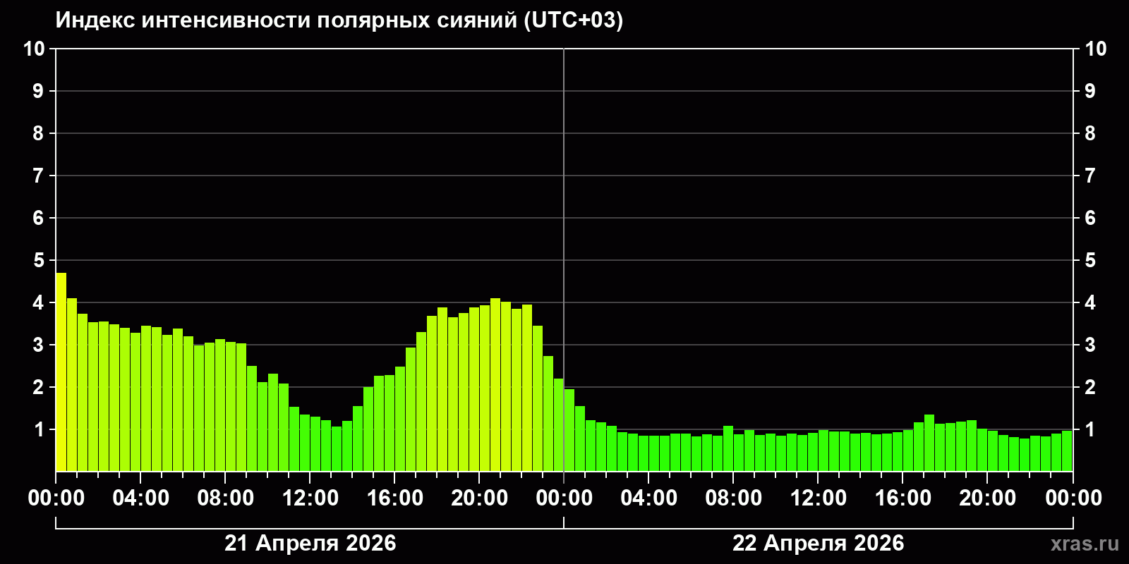 Изменения индекса интенсивности полярных сияний с 2026-04-21 по 2026-04-22 по местному времени