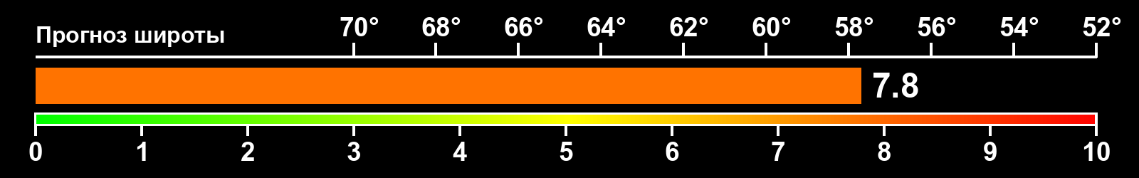 Индекс интенсивности полярных сияний и теоретически возможная широта наблюдений для ночного времени в восточном полушарии по состоянию на 2025-10-01 23:50 (конец дня) по местному времени
