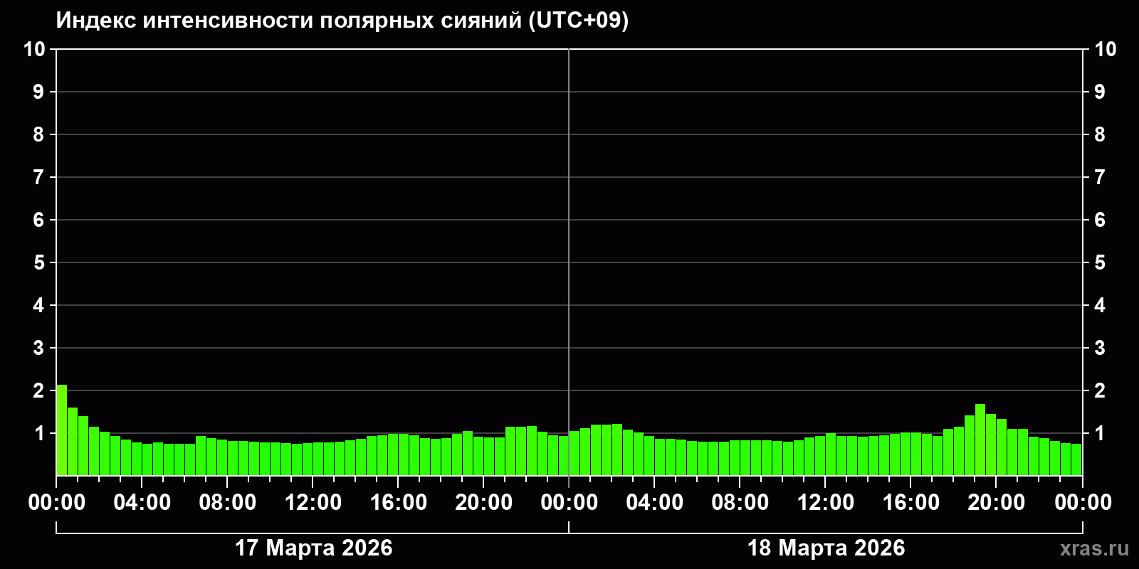 Изменения индекса интенсивности полярных сияний с 2026-03-17 по 2026-03-18 по местному времени