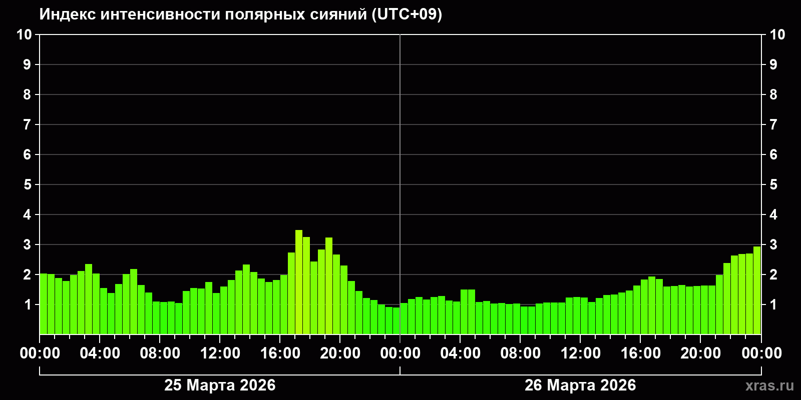 Изменения индекса интенсивности полярных сияний с 2026-03-25 по 2026-03-26 по местному времени