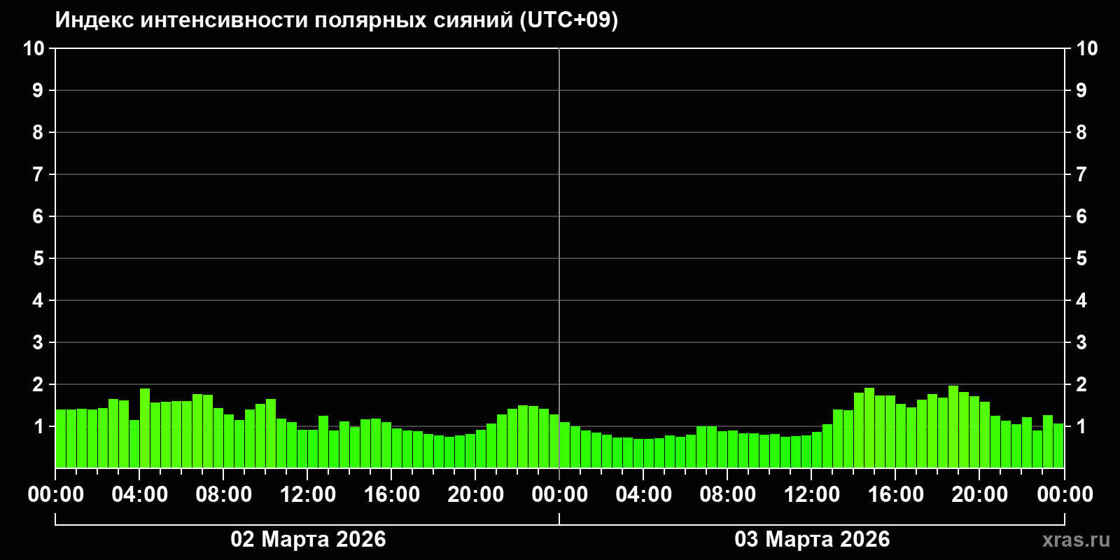 Изменения индекса интенсивности полярных сияний с 2026-03-02 по 2026-03-03 по местному времени