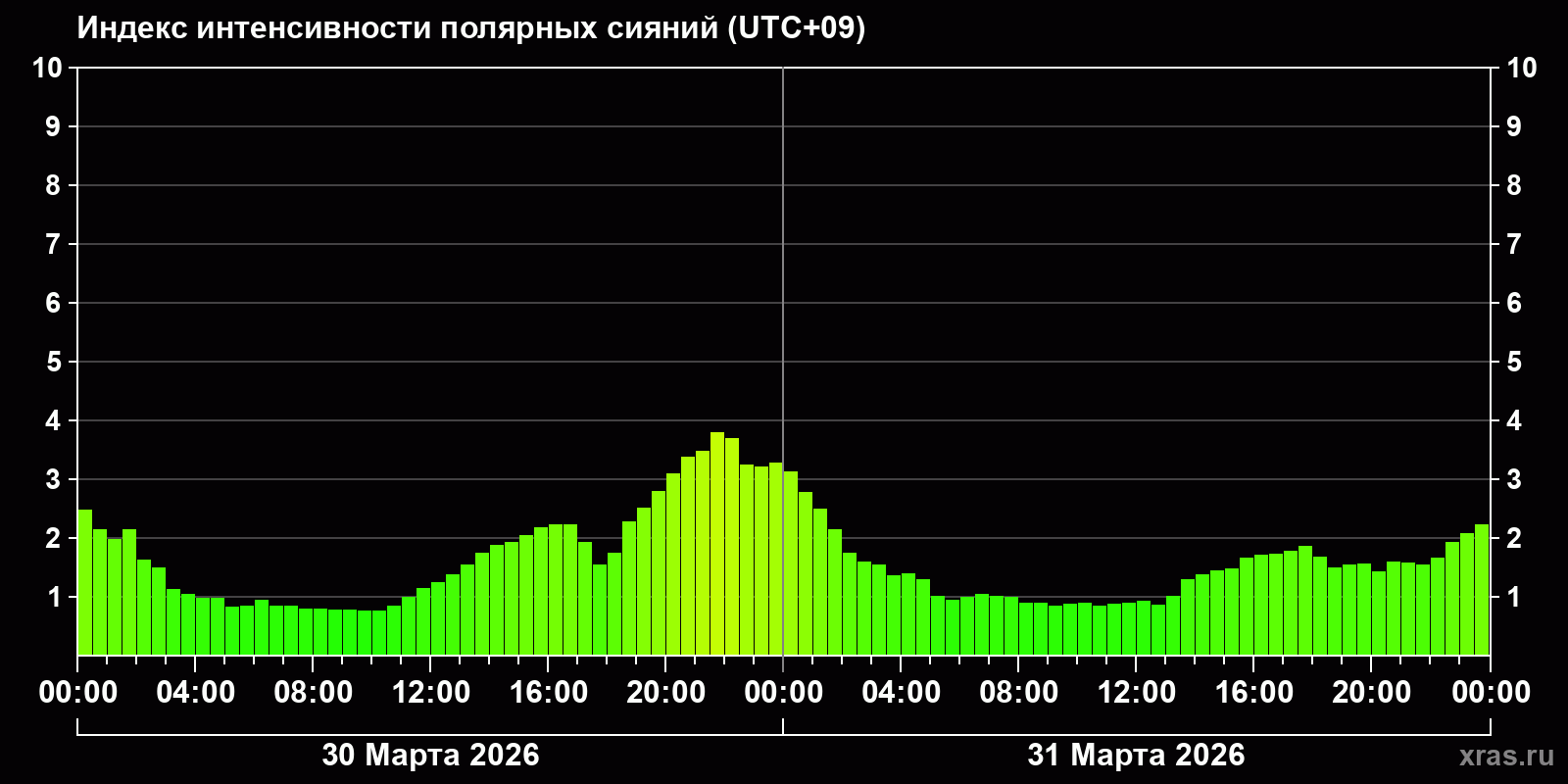 Изменения индекса интенсивности полярных сияний с 2026-03-30 по 2026-03-31 по местному времени