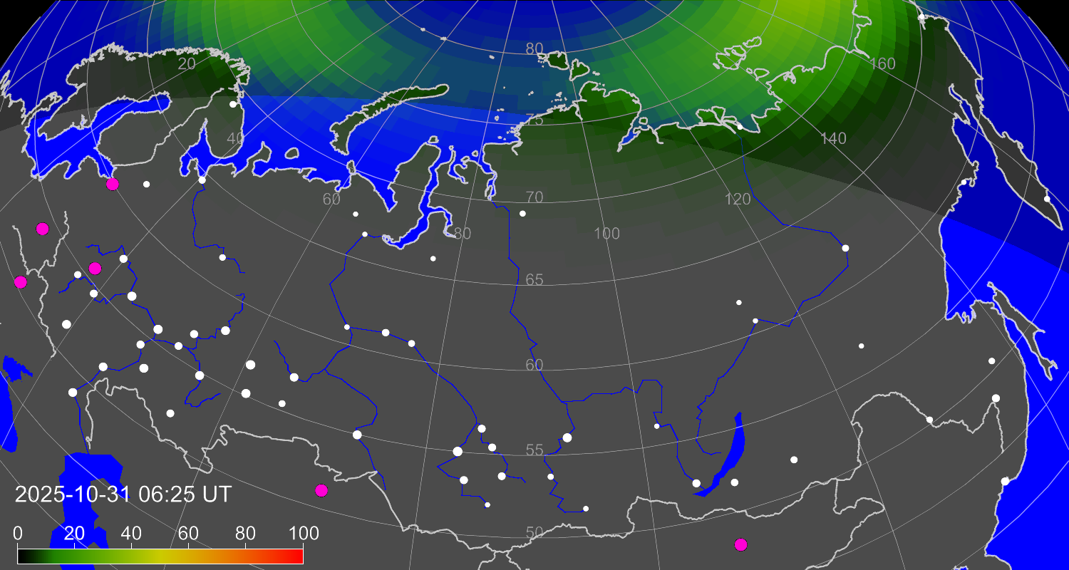 Изменения и часовой прогноз индекса интенсивности полярных сияний с 2025-10-30 по 2025-10-31