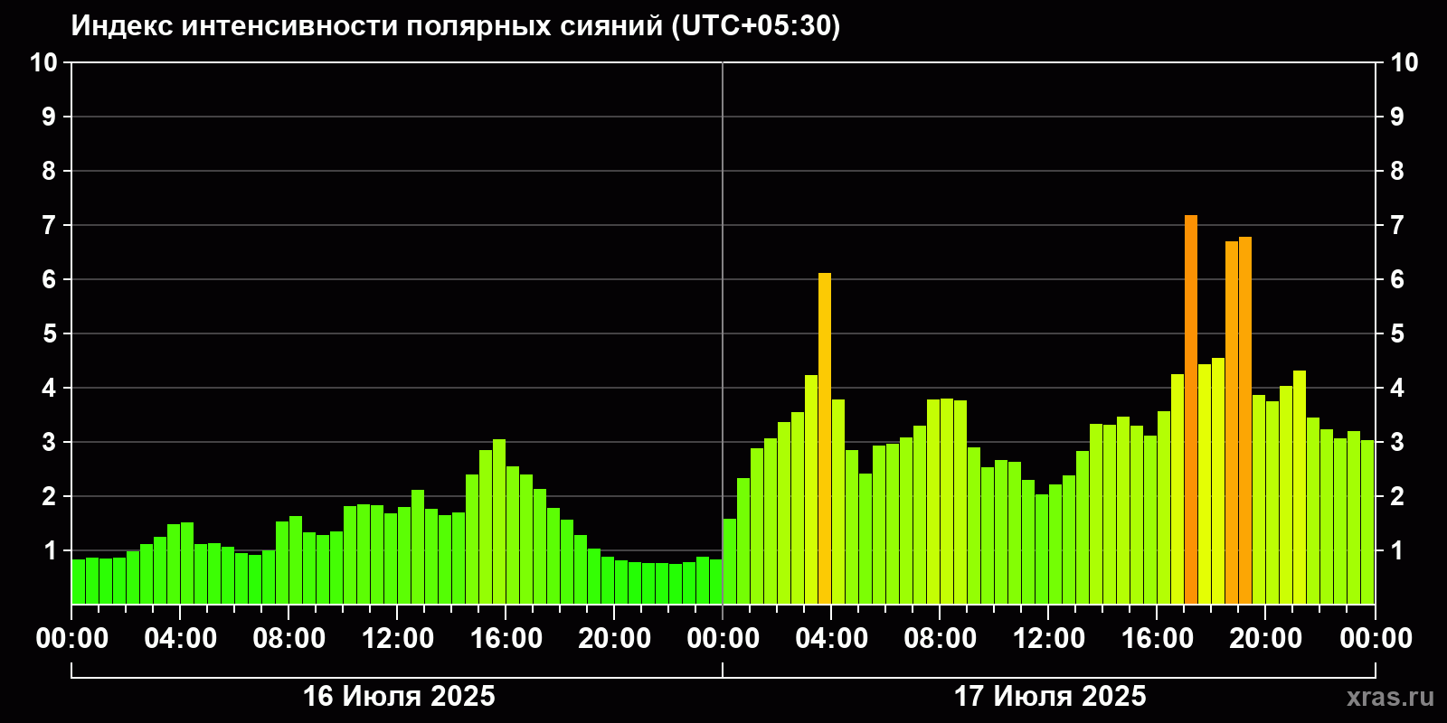 Изменения индекса интенсивности полярных сияний с 2025-07-16 по 2025-07-17 по местному времени