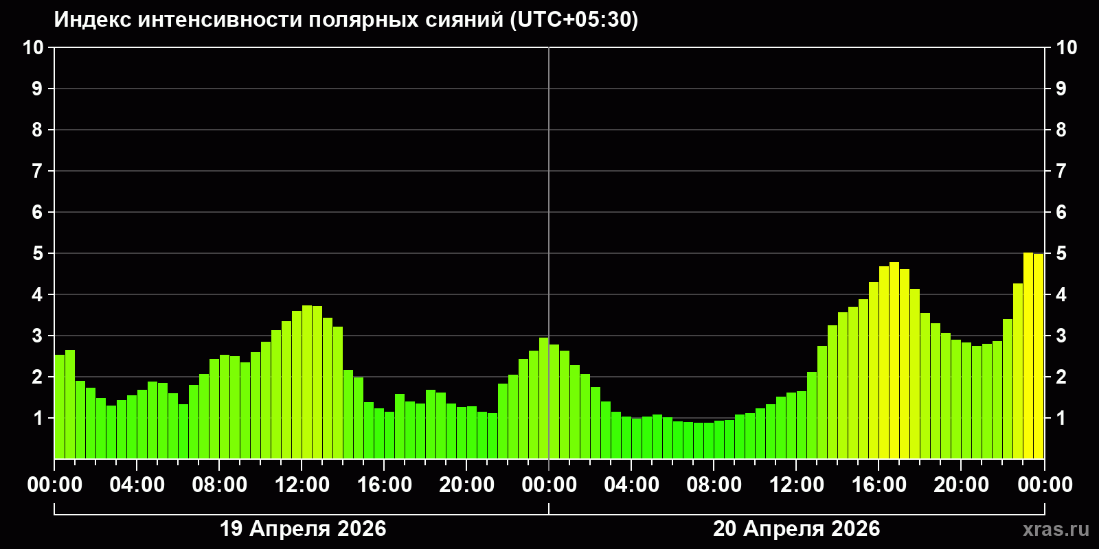 Изменения индекса интенсивности полярных сияний с 2026-04-19 по 2026-04-20 по местному времени